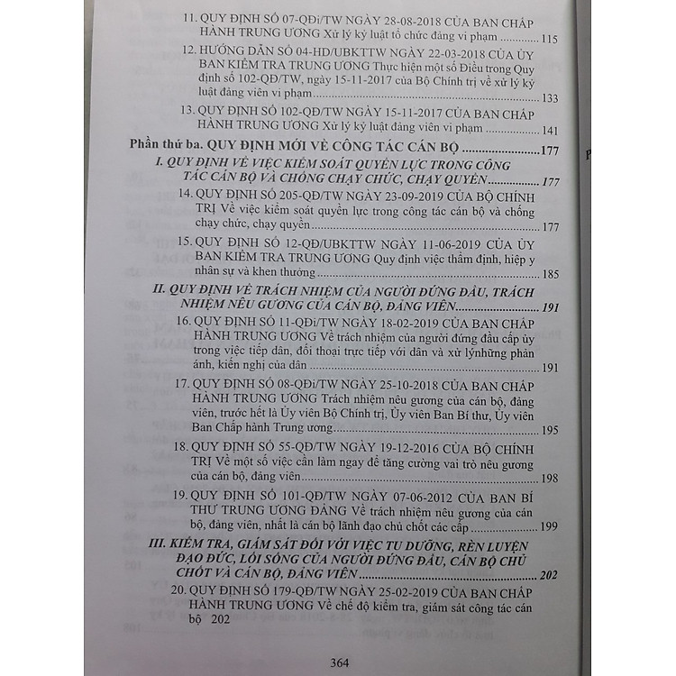 Nhằm nâng cao năng lực lãnh đạo, sức chiến đấu của Ðảng, sự đoàn kết thống nhất, giữ gìn kỷ luật, kỷ cương của Ðảng trong công tác cán bộ, thời gian qua, nhiều quy định, hướng dẫn của Ban Bí thư, Ban Chấp hành Trung ương đã được ban hành như: Quy định 205-QĐ/TW ngày 23-09-2019 Về việc kiểm soát quyền lực trong công tác cán bộ và chống chạy chức, chạy quyền, Quy định 13-QĐ/UBKTTWngày 18-09-2019 Về tiếp nhận, xử lý đơn thư, tiếp đảng viên và công dân, Quy định 12-QĐ/UBKTTW ngày 11-06-2019 Về việc thẩm định, hiệp y nhân sự và khen thưở