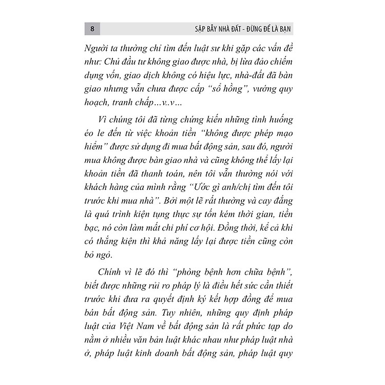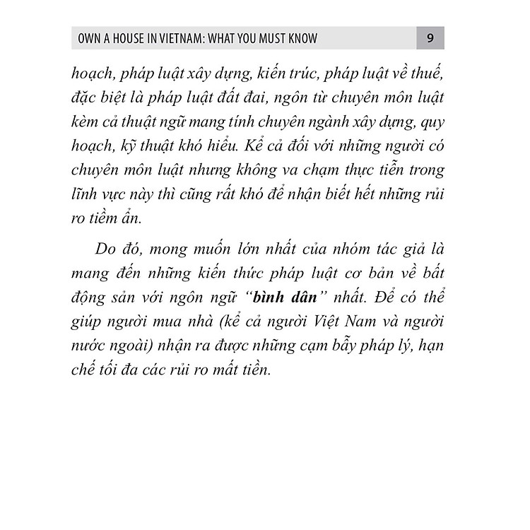Cuốn sách này được viết với mong muốn bảo vệ những người yếu thế trong “cuộc chơi” bất động sản tại Việt Nam. Xuất phát từ thực tế nhiều người mua nhà thiếu kiến thức pháp lý, dẫn đến rủi ro mất tiền hoặc gặp tranh chấp phức tạp, nhóm tác giả – gồm hai người bạn có chung trăn trở – đã tổng hợp những kiến thức pháp luật quan trọng về bất động sản bằng ngôn ngữ đơn giản, dễ hiểu. Cuốn sách không chỉ giúp người mua nhà nhận diện các rủi ro tiềm ẩn mà còn trang bị kỹ năng phòng tránh những cạm bẫy pháp lý, nhằm bảo vệ tài sản và quyền lợi của mình.