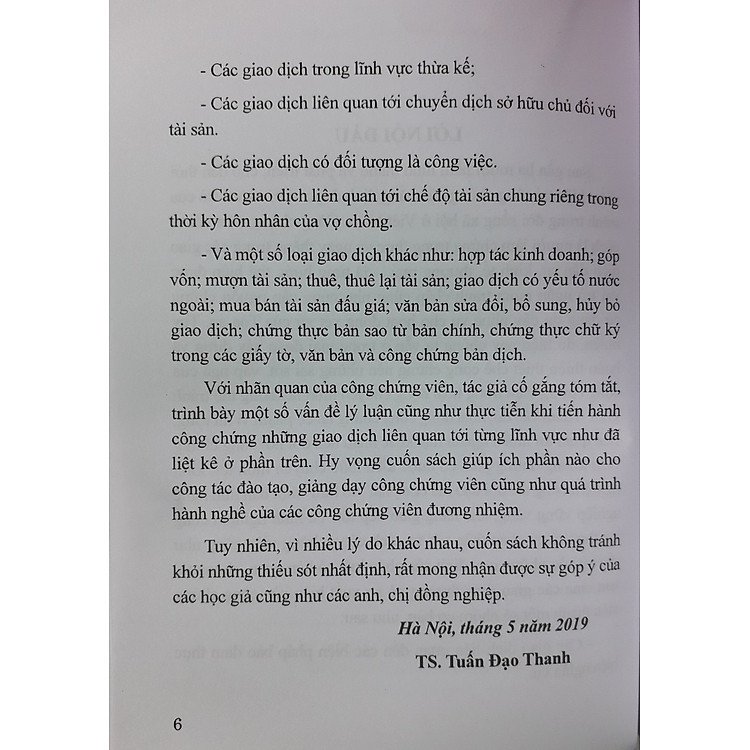 Cuốn sách chuyên khảo trình bày một số vấn đề lý luận cũng như thực tiễn khi tiến hành công chứng những giao dịch liên quan tới từng lĩnh vực như các biện pháp bảo đảm thực hiện nghĩa vụ, lĩnh vực thừa kế, chuyển dịch sở hữu chủ đối với tài sản, giao dịch có đối tượng là công việc, giao dịch liên quan tới chế độ tài sản chung riêng trong thời kỳ hôn nhân của vợ chồng…