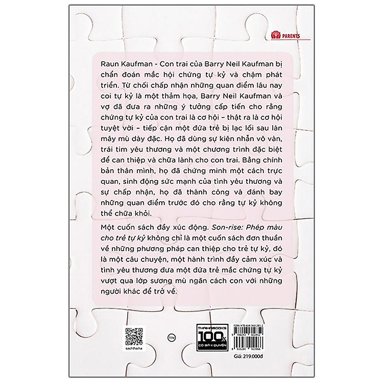 Son-Rise: Phép màu cho trẻ tự kỷ Công ty phát hành: Thái Hà Tác giả: Barry Neil Kaufman & Raun Kaufman Khổ: 15.5×24 cm Số trang: 500 trang NXB: Lao động Năm xuất bản: 2022 [ThaiHaBooks] Son-rise: Phép màu cho trẻ tự kỷ là một tài liệu vô cùng hữu ích dành cho những bậc cha mẹ có con mắc chứng tự kỷ, giúp cha mẹ bổ sung kiến thức vào “nghiệp vụ làm cha mẹ” của mình khi chăm sóc và giáo dục trẻ. Sách đặc biệt hữu ích cho những người hoạt động trong ngành giáo dục đặc biệt, các thầy cô giáo trực tiếp làm việc cùng trẻ tự kỷ. Một cuốn sách đầy cảm hứng mà tất cả chúng ta đều có thể học hỏi. Nó không chỉ dành cho tất cả các bậc phụ huynh, mà còn cho tất cả chúng ta để đối phó với nghịch cảnh. Nếu bạn là một người cởi mở, chấp nhận để thay đổi, đón nhận thử thách và được truyền cảm hứng, hãy đọc nó. Đây là một cuốn sách, nhưng đồng thời nó cũng là một câu chuyện, một cuốn nhật ký về hành trình đưa một em bé tự kỷ trầm trọng hòa nhập với cuộc sống bình thường. Đó là về gia đình Kaufman có hai bé gái, họ đang mong ngóng từng ngày đứa con thứ ba chào đời. Một bé trai. Nhưng khi bé được 1 tuổi tháng tuổi, cha mẹ của bé phát hiện những điều khác lạ ở con trai mình. Cậu không đáp lại những tương tác của cha mẹ và mọi tiếng động xung quanh. Cậu bé chìm đắm vào một thế giới riêng, tách biệt và cô độc. Raun Kahlil – cậu bé đang ở ngoài rìa vũ trụ. Dường như cậu bé ấy đang ở trong một vỏ bọc vô hình nhưng chẳng thể xuyên thủng. Họ đưa con đi khám ở nhiều nơi, nhưng người ta không đưa ra được một kết luận cụ thể nào. Chính cha cậu bé đã tự phát hiện ra: Tự kỷ. Hai tiếng đó rơi vào lòng người làm cha mẹ như hòn đá nặng trịch rơi xuống mặt hồ. Dù đã đưa con đi khám và chẩn đoán lại, nhưng kết quả vẫn không khả quan. Thời đó, người ta cho rằng tự kỷ không thể chữa khỏi và cách duy nhất có thể làm được là đưa cậu bé vào một trung tâm chăm sóc đặc biệt. Cha mẹ của Raun không muốn thế, họ không muốn từ bỏ đứa con yêu dấu của mình. Họ tự viết ra một chương trình can thiệp tại nhà và bắt đầu cố gắng kéo cậu bé ra khỏi lớp màng tách biệt mà con không thể tự phá bỏ. Quá trình ấy kéo dài nhiều tháng trời, đã có lúc họ kiệt quệ, mệt mỏi và phải quay lại từ đầu, nhưng họ kiên trì không từ bỏ. Những phản ứng của con trai dần dần có bước tiến, dù rất nhỏ. Đến khi tất cả vỡ òa khi Raun nói được tiếng đầu tiên. Đến bây giờ, sau gần 20 năm, Raun đã trở thành một sinh viên năng động và khỏe mạnh hoàn toàn, và chương trình của gia đình Kaufman đã trở thành một chương trình tuyệt vời giúp đỡ bao nhiêu gia đình có trẻ tự kỷ khác. Hành trình của gia đình Kaufman là một hành trình của hy vọng, của niềm tin. Họ đã tìm lại được con trai của mình sau bao tháng ngày chờ đợi và nỗ lực. Chiến thắng của họ là thông điệp vô cùng chi tiết và rõ ràng, là chiến thắng của tình yêu thương đối với chứng tự kỷ, một chiến thắng đầy thuyết phục và có thể dễ dàng học tập theo. Cuốn sách này chính là hành trình tuyệt vời, câu chuyện đầy cảm xúc tác động đến trái tim của tất cả mọi người.