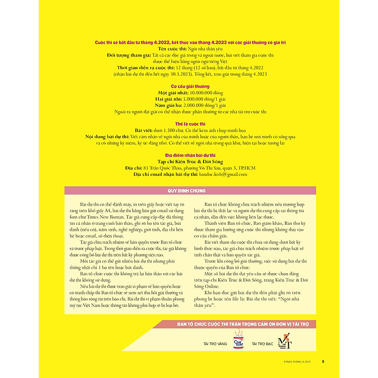 Nhằm tạo ra sân chơi bổ ích cho bạn đọc, chia sẻ thông điệp yêu thương, góp phần vun đắp xây dựng gia đình hạnh phúc, tạp chí Kiến Trúc & Đời Sống tổ chức cuộc thi viết với chủ đề “Ngôi nhà thân yêu” với nhiều giải thưởng hấp dẫn dành cho tất cả các độc giả trong và ngoài nước.