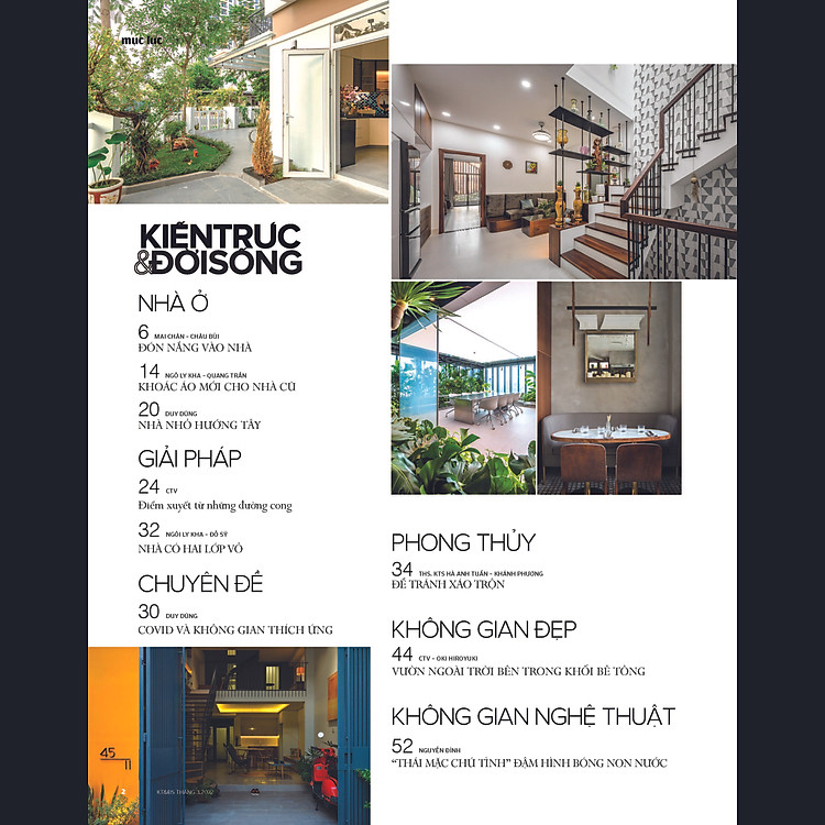 Cũng trong số báo này, bên cạnh những công trình đặc sắc của các kiến trúc sư được giới thiệu thông qua những chuyên mục quen thuộc, độc giả cũng có thể tham khảo những bài viết cụ thể nhưng hữu ích như “Xu hướng sân vườn 2022 – chủ nghĩa hướng ngoại an toàn”; “Covid và không gian thích ứng” viết về sự linh hoạt của con người khi phải liên tục thay đổi cách sinh hoạt, ứng xử trong một môi trường cố định nhưng yêu cầu tiếp xúc, sinh hoạt lại phải theo kịp đòi hỏi của việc đề phòng, ngăn ngừa lây lan dịch bệ
