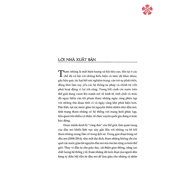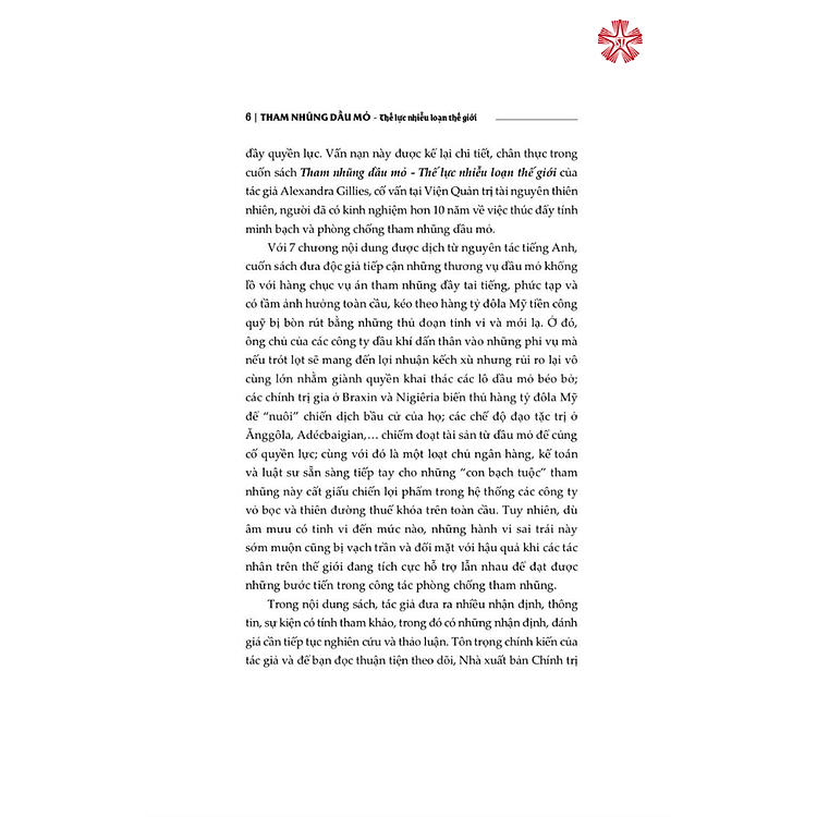 Tất cả sẽ được kể lại chi tiết, chân thực trong cuốn sách Tham nhũng dầu mỏ – Thế lực nhiễu loạn thế giới của tác giả Alexandra Gillies, cố vấn tại Viện Quản trị tài nguyên thiên nhiên, người đã có kinh nghiệm hơn 10 năm về việc thúc đẩy tính minh bạch và phòng chống tham nhũng dầu mỏ. Đi sâu phân tích cuộc khủng hoảng tham nhũng bùng nổ trong thời kỳ hoàng kim của dầu mỏ với những ví dụ minh họa cụ thể, chi tiết về một loạt các vụ án tham nhũng nổi tiếng ở Ănggôla, Nigiêria, Adécbaigian, Nga, Malaixia,… giúp bạn đọc thấy được những mánh khóe tinh vi nhằm bòn rút hàng tỷ đôla Mỹ từ dầu mỏ để làm giàu cho những cá nhân đầy quyền lực.