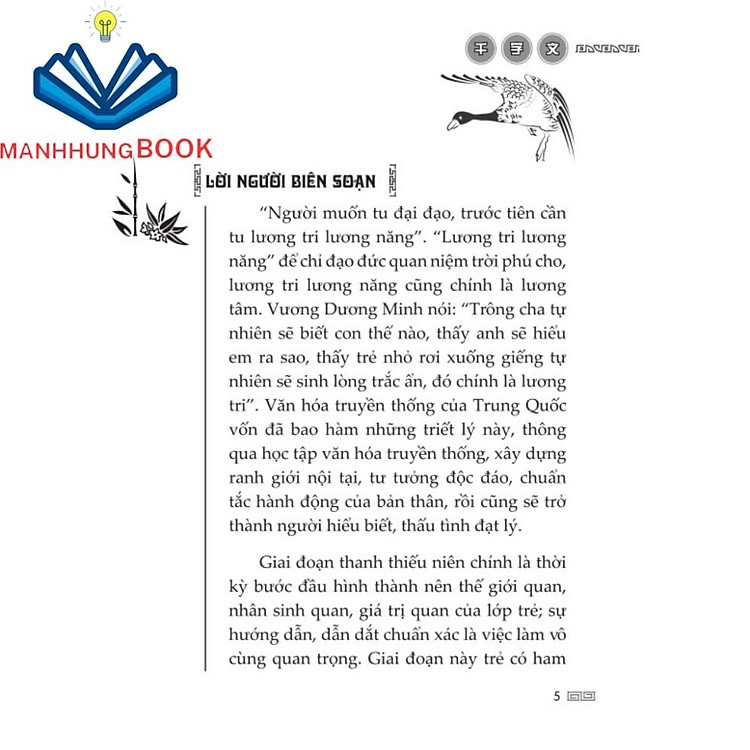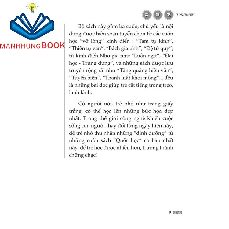 Có người nói, trẻ nhỏ như trang giấy trắng, có thể họa lên những bức họa đẹp nhất. Trong thế giới công nghệ khiến cuộc sống con người thay đổi từng ngày hiện này, để trẻ nhỏ thu nhận những “dinh dưỡng” từ những cuốn sách “Quốc học” cơ bản nhất này, để trẻ học được nhiều hơn, trưởng thành chững chạc!