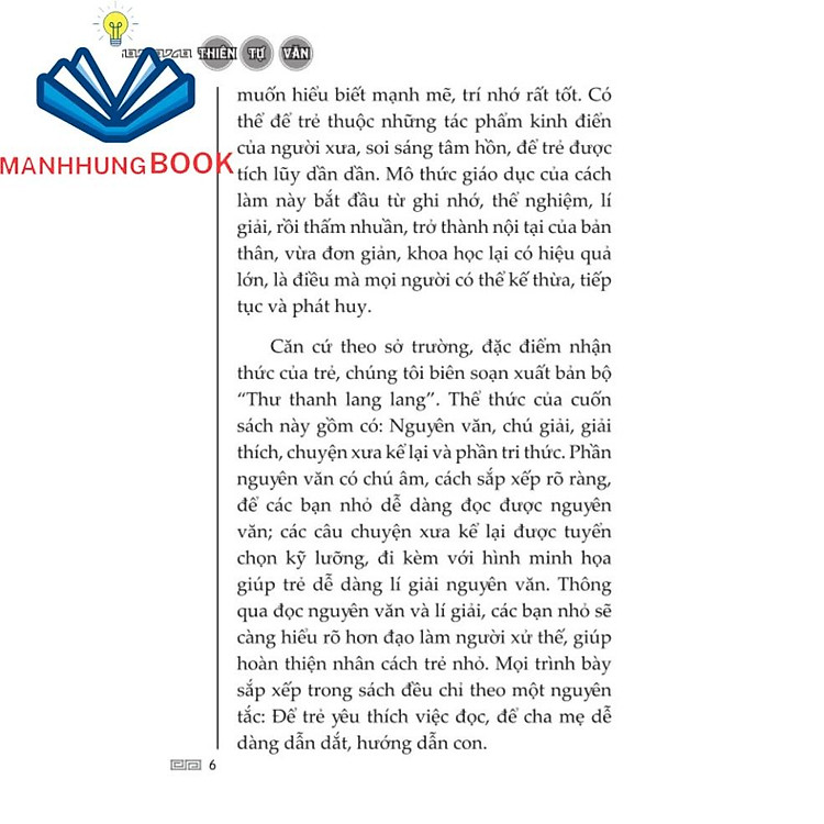 Căn cứ theo sở trường, đặc điểm nhận thức của trẻ, chúng tôi biên soạn xuất bản bộ “Thư thanh lang lang”. Thể thức của cuốn sách này gồm có: Nguyên văn, chú giải, giải thích, chuyện xưa kể lại và phần tri thức. Phần nguyên văn có chú âm, cách sắp xếp rõ ràng, để các bạn nhỏ dễ dàng đọc được nguyên văn; các câu chuyện xưa kể lại được tuyển chọn kỹ lưỡng, đi kèm với hình minh họa giúp trẻ dễ dàng lí giải nguyên văn.