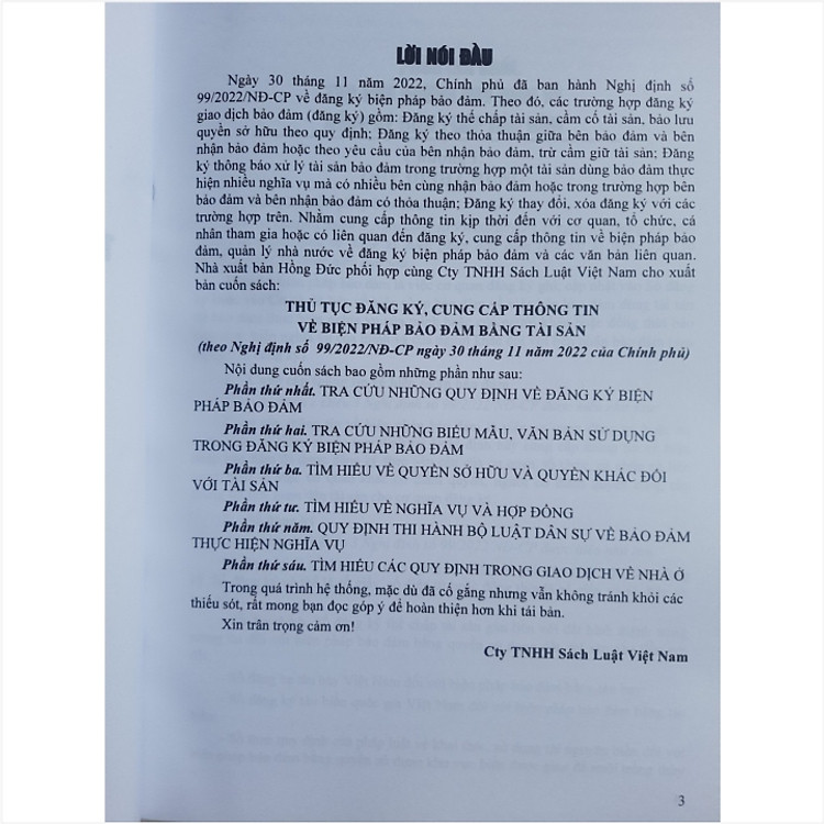 Nhằm cung cấp thông tin kịp thời đến với cơ quan, tổ chức, cá nhân tham gia hoặc có liên quan đến đăng ký, cung cấp thông tin về biện pháp bảo đảm, quản lý nhà nước về đăng ký biện pháp bảo đảm và các văn bản liên quan. Nhà sách Nam Việt xin trân trọng giới thiệu cuốn sách: THỦ TỤC ĐĂNG KÝ, CUNG CẤP THÔNG TIN VỀ BIỆN PHÁP BẢO ĐẢM BẰNG TÀI SẢN (theo Nghị định số 99/2022/NĐ-CP ngày 30 tháng 11 năm 2022 của Chính phủ)