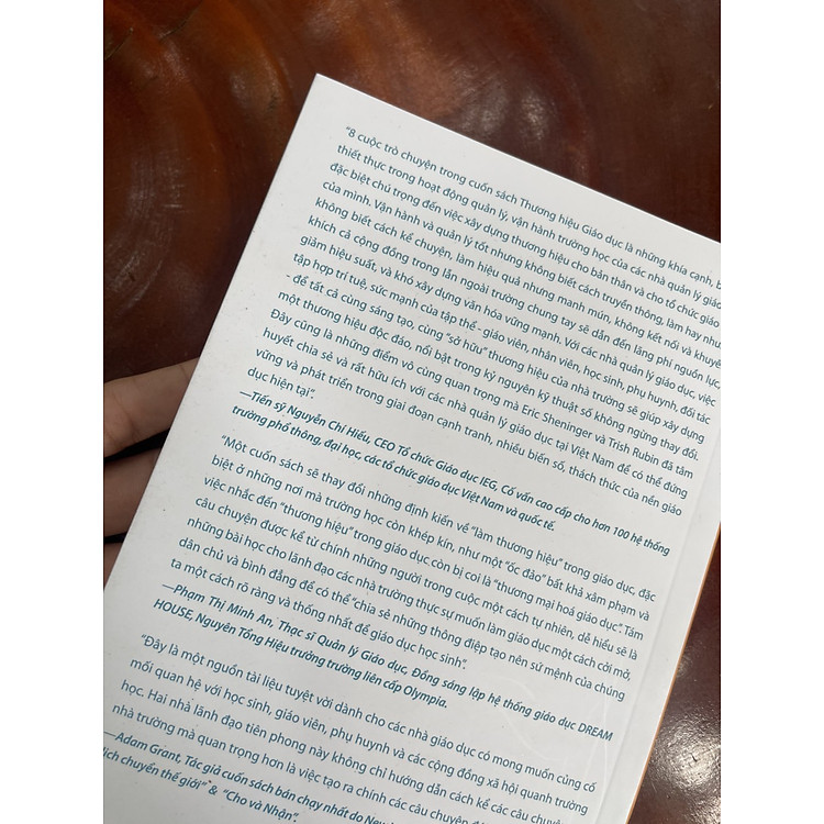 “Một cuốn sách sẽ thay đổi những định kiến về “làm thương hiệu” trong giáo dục, đặc biệt ở những nơi mà trường học còn khép kín, như một “ốc đảo” bất khả x.â p.h.ạ và việc nhắc đến “thương hiệu” trong giáo dục còn bị coi là “thương mại hoá giáo dục”. Tám câu chuyện được kể từ chính những người trong cuộc một cách tự nhiên, dễ hiểu sẽ là những bài học cho lãnh đạo các nhà trường thực sự muốn làm giáo dục một cách cởi mở, dân chủ và bình đẳng để có thể “chia sẻ những thông điệp tạo nên sứ mệnh của chúng ta một cách rõ ràng và thống nhất để giáo dục học sinh”.
