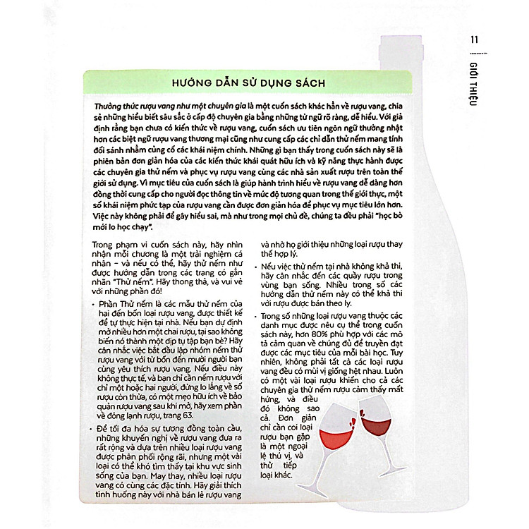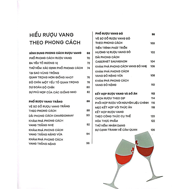 Hướng dẫn thử nếm rượu vang: Thử nếm rượu vang theo cách của bạn ngay tại nhà, sau đó làm theo và đối chiếu với 12 hướng dẫn thử nếm được cung cấp trong cuốn sách. Từ đó, phân biệt các phong cách rượu vang chính trên thế giới.