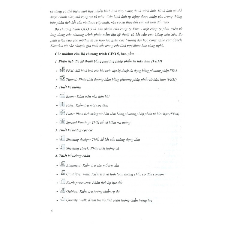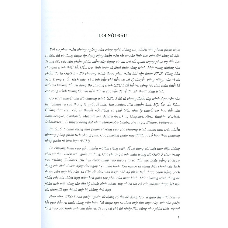 Với sự phát triển không ngừng của công nghệ thông tin, nhiều sản phẩm phần mềm ra đời, đã và đang được áp dụng rộng khắp trên tất cả các lĩnh vực của đời sống xã hội. Trong đó, các sản phẩm phần mềm xây dựng có vai trò rất quan trọng phục vụ đắc lực cho quá trình thiết kế, kiểm tra, tính toán và khai thác công trình. Một trong những sản phẩm đó là GEO 5 – Bộ chương trình được phát triển bởi tập đoàn FINE, Cộng hòa Séc. Trong cuốn sách này, sẽ trình bày chi tiết: cơ sở lý thuyết, công năng, các ví dụ mẫu và hướng dẫn sử dụng Bộ chương trình GEO 5 để hỗ trợ công tác tính toán thiết kế các công trình tương tác với nền đất và các vấn đề về địa kỹ thuật công trình,