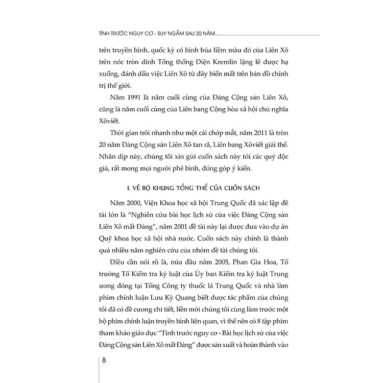 Tính trước nguy cơ – Suy ngẫm sau 20 năm Đảng Cộng sản Liên Xô mất đảng” là một tác phẩm nghiên cứu sâu rộng, cung cấp cái nhìn toàn diện về sự sụp đổ của một trong những cường quốc lớn nhất thế kỷ 20,không chỉ đơn thuần kể lại lịch sử, mà còn đi sâu phân tích các nguyên nhân dẫn đến sự thất bại của Đảng Cộng sản Liên Xô, đồng thời rút ra những bài học kinh nghiệm quý báu.