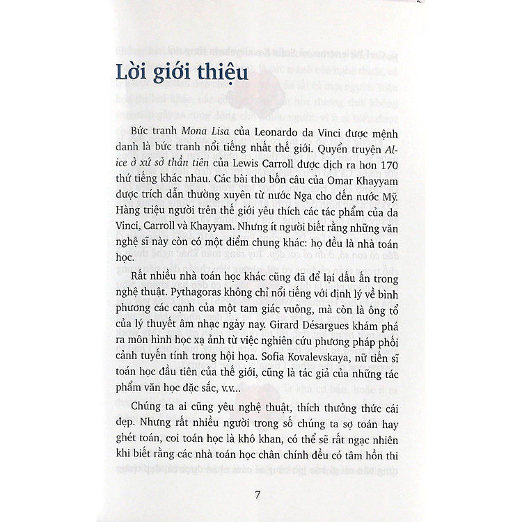 Bức tranh Mona Lừa của Leonardo da Vinci được mệnh danh là bức tranh nổi tiếng nhất thế giới. Quyển truyện Alice ở xứ sở thần tiên của Lewis Carroll được dịch ra hơn 170 thứ tiếng khác nhau. Các bài thơ bốn câu của Omar Khayyam được trích dẫn thường xuyên từ nước Nga cho đến nước Mỹ. Hàng triệu ngưòi trên thế giới yêu thích các tác phẩm của da Vinci, Carroll và Khayyam. Nhưng ít người biết rằng những văn nghệ sĩ này còn có một điểm chung khác: họ đều là nhà toán học.