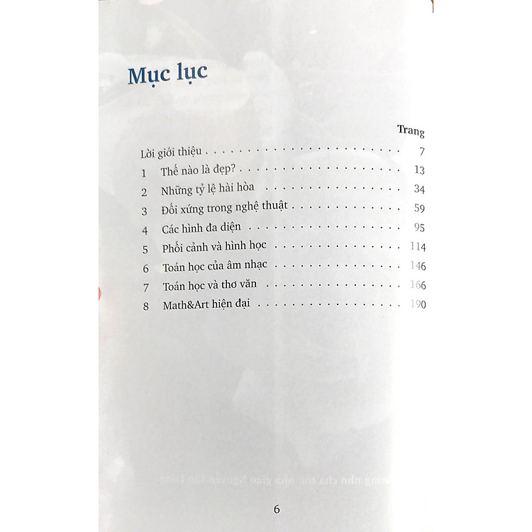 Quyển sách nhỏ này gồm tám chương, bàn về các thể loại nghệ thuật khác nhau, từ kiến trúc, hình họa cho đến âm nhạc, thơ ca, và sự liên quan với toán học. Phần lón các kiến thức về nghệ thuật cũng như về toán ỏ đây là khá cơ bản, hoặc ít ra được giải thích một cách đơn giản, sao cho học sinh phổ thông, thậm chí ỏ bậc tiểu học, cũng có thể hiểu được phần nhiều.