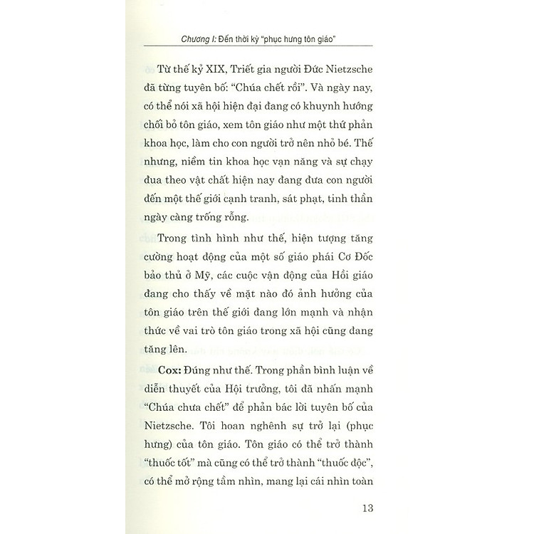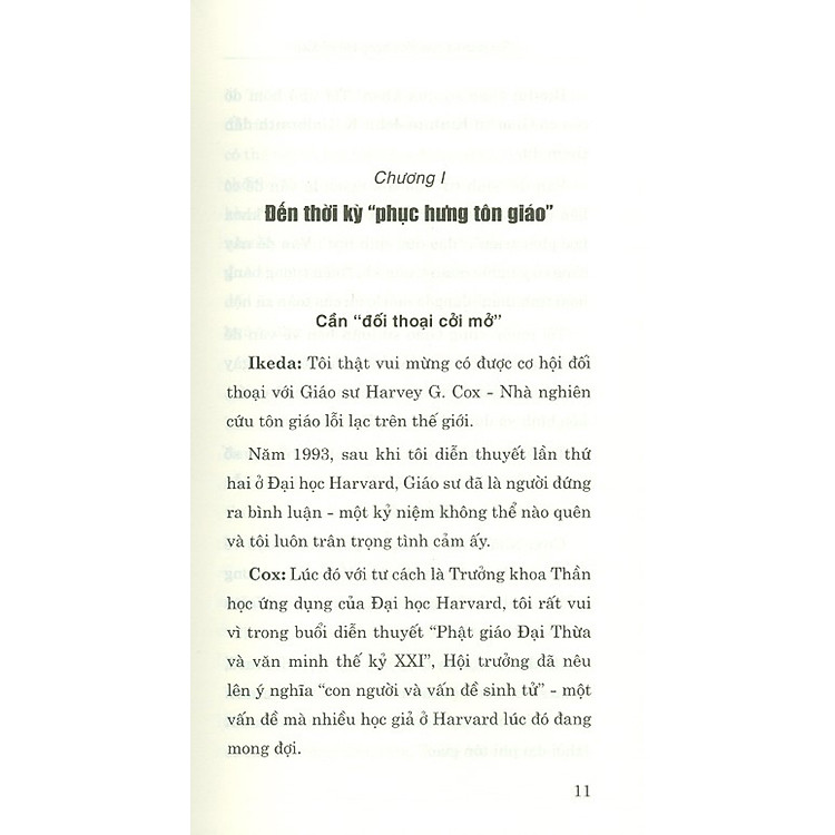 Nội dung cuốn sách được trình bày dưới hình thức một cuộc đối thoại cởi mở và đầy trách nhiệm giữa Tiến sĩ tôn giáo học Harvey G.Cox – chuyên gia nghiên cứu hàng đầu người Mỹ về vấn đề tôn giáo – văn hóa – chính trị và Tiến sĩ Ikeda Daisaku – học giả uyên bác về nhiều lĩnh vực khoa học, nhà văn hóa nổi tiếng ở Nhật Bản cũng như trên thế giới.