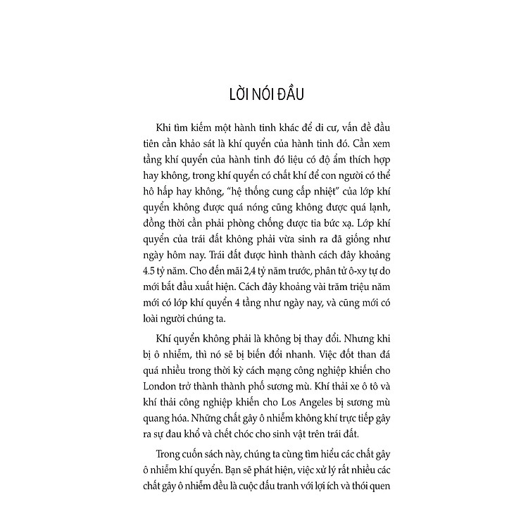 Trong cuốn sách này, chúng ta cùng tìm hiểu các chất gây ô nhiễm khí quyển. Bạn sẽ phát hiện, việc xử lý rất nhiều các chất gây ô nhiễm đều là cuộc đấu tranh với lợi ích và thói quen của con người. Chẳng hạn, việc nghiêm cấm sử dụng xăng chứa chì gây tổn hại cho ngành công nghiệp hóa học, việc đưa ra các tiêu chuẩn nghiêm ngặt đối với khí thải xe hơi đã đe dọa ngành công nghiệp xe hơi. Thậm chí, hạn chế lái xe hơi và đốt than, đều ảnh hưởng đến thói quen sinh hoạt của con người. Bạn cũng hiểu được rằng, bây giờ có thể dùng phương pháp gì để làm sạch khí quyển. Mỗi một đồ vật mà chúng ta sử dụng đều có nguồn gốc, và có một nơi để đi về. Chúng ta không muốn rằng cuối cùng chúng sẽ biến thành vật gây ô nhiễm. Không khí trong lành là báu vật có giá trị nhất đối với loài người.