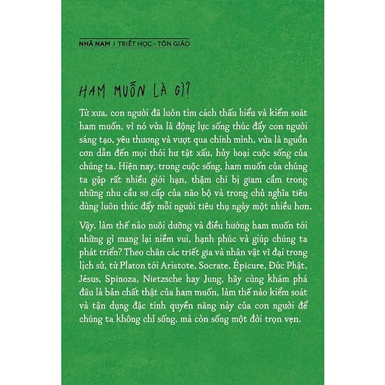 Vậy, làm thế nào nuôi dưỡng và điều hướng ham muốn tới những gì mang lại niềm vui, hạnh phúc và giúp chúng ta phát triển? Theo chân các triết gia và nhân vật vĩ đại trong lịch sử, từ Platon tới Aristote, Socrate, Espicure, Đức Phật, hãy cùng khám phá đâu là bản chất thật của ham muốn, làm thế nào kiểm soát và tận dụng đặc tính quyền năng này của con người để chúng ta không chỉ sống, mà còn sống một đời trọn vẹn.