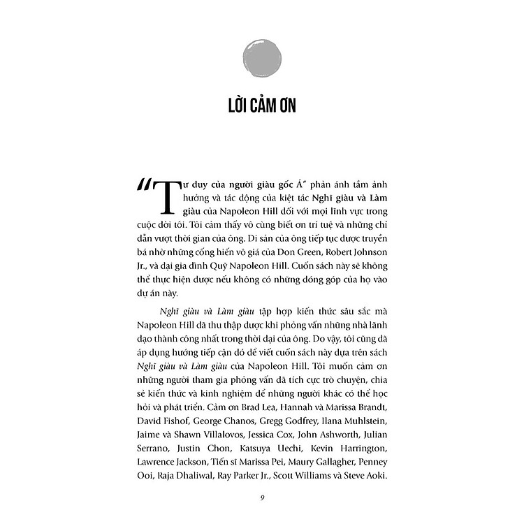 Nghĩ giàu và Làm giàu không chỉ là cuốn sách thành công nhất của Napoleon Hill mà còn là cuốn sách bán chạy nhất mọi thời đại. 13 nguyên tắc thành công được giới thiệu trong cuốn sách phù hợp với tất cả mọi người và vẫn còn mang tính thời sự cho đến ngày nay. Hiện nay đã có các phiên bản khác nhau dành cho người Mỹ Latinh, người Mỹ gốc Phi và nữ giới. Vậy thì tại sao lại không có một phiên bản đặc biệt dành cho người châu Á? Và Tư duy của người giàu gốc Á ra đời chính là để đại diện cho một trong những nền văn hóa quan trọng nhất trên hành tinh này.