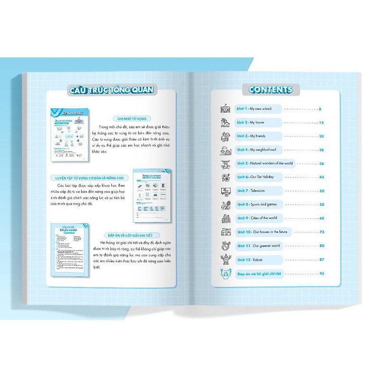 Nội dung kiến thức bám sát theo các chủ đề bài học theo chương trình sách giáo khoa của Bộ giáo dục và Đào tạo, vừa giúp các em củng cố kiến thức cơ bản vừa mở rộng và thực hành kiến thức nâng cao, hỗ trợ quá trình tự học tiếng Anh hiệu quả.