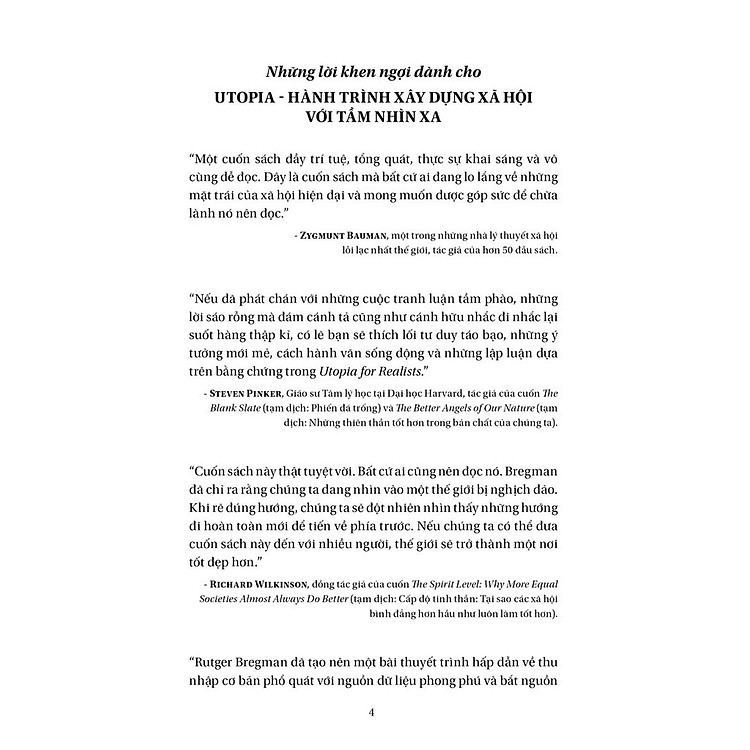 Rutger Bregman là nhà tư tưởng thế hệ mới, quan điểm lí luận của anh đã phá vỡ hệ tư tưởng nặng nề tồn tại suốt 40 năm qua, đồng thời cũng phá vỡ quỹ đạo cuộc sống xã hội ngột ngạt hiện tại. Những quan điểm lí luận đó được thể hiện rõ nét trong Utopia – Hành trình xây dựng xã hội với tầm nhìn xa.