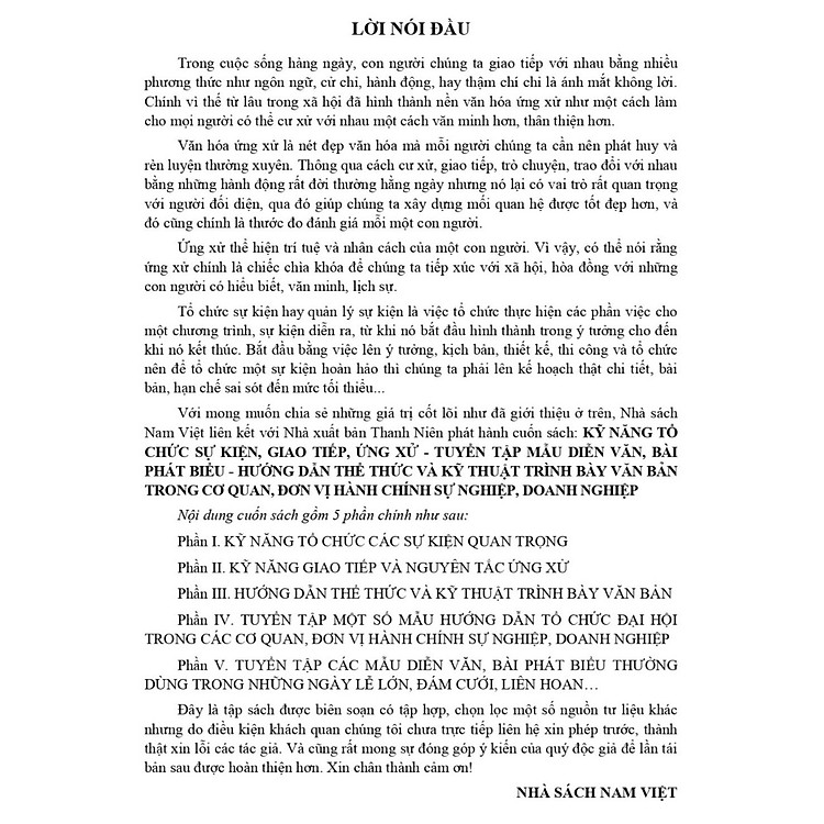 - Sách bao gồm hướng dẫn kỹ năng tổ chức sự kiện, giao tiếp và ứng xử trong cơ quan, doanh nghiệp.