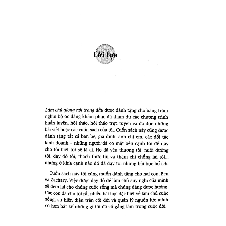 Mục lục sách có tiêu đề mình thấy khá thú vị! Các chương đầu của sách sẽ làm rõ các nguyên nhân hình thành giọng nói trong đầu, ảnh hưởng của nó đến đời sống cũng như công việc. Còn về 2 chương cuối là nói về các thủ thuật để kiểm soát nó. Riêng mình thấy khá hữu ích và thực tế, các bạn có thể tham khảo.