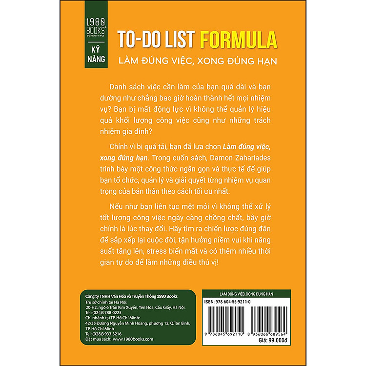 “Làm Đúng Việc, Xong Đúng Hạn” của tác giả Damon Zahariades là một hướng dẫn thiết thực về cách tạo lập và sử dụng danh sách việc cần làm hiệu quả. Cuốn sách này không chỉ chỉ ra những lý do khiến chúng ta thường thất bại khi sử dụng danh sách công việc, mà còn cung cấp 10 loại danh sách phổ biến cùng từng bước cụ thể để lập nên một danh sách hoàn hảo. Đặc biệt, tác giả còn chia sẻ cách duy trì và tối ưu hóa hệ thống quản lý nhiệm vụ, giúp bạn có thể dễ dàng quản lý mọi khía cạnh trong cuộc sống.