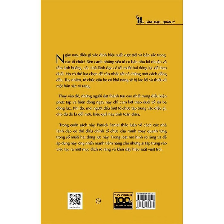 Nói nôm na là, cuốn sách này giúp bạn hiểu rõ hơn về mười hai động lực mà các nhà lãnh đạo có thể theo đuổi, nhưng chỉ cần tập trung vào ba động lực chính để tạo ra hiệu suất vượt trội. Patrick sẽ giải thích cách mà việc xác định rõ ràng mục đích lãnh đạo có thể giúp tổ chức của bạn không bị lạc lối. Có thể bạn sẽ tự hỏi, “Tại sao chỉ cần ba động lực?” Đó chính là chìa khóa để mọi người cùng nhau hướng về một mục tiêu chung!