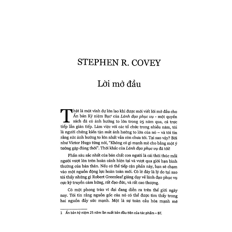 Lãnh Đạo Phục Vụ là một tác phẩm nổi bật trong lĩnh vực lãnh đạo chuyển hóa, được viết bởi Robert K. Greenleaf. Cuốn sách không chỉ đơn thuần định nghĩa “lãnh đạo phục vụ” mà còn đào sâu vào các khái niệm như tổ chức phục vụ, và vai trò của những người lãnh đạo trong việc xây dựng một môi trường làm việc tích cực. Greenleaf đã dành nhiều tâm huyết để tạo nên một bức tranh toàn diện, từ khái niệm đến thực tiễn, giúp các nhà lãnh đạo nhận ra sức mạnh của việc phục vụ trong tổ chức của mình. Cuốn sách này sẽ giúp bạn trở thành một nhà lãnh đạo không chỉ hiệu quả mà còn đầy tính nhân văn.