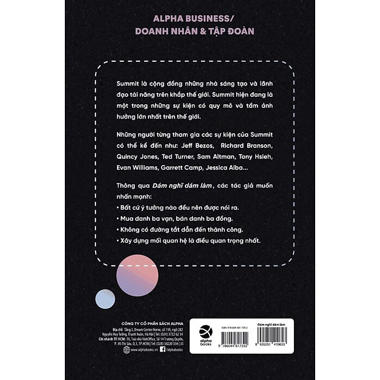 Dám Nghĩ Dám Làm được viết bởi bốn chàng trai trẻ: Elliott Bisnow, Brett Leve, Jeff Rosenthal và Jeremy Schwartz, những người đã cùng nhau biến ước mơ khởi nghiệp thành hiện thực. Họ đã từng đối mặt với không ít khó khăn, từ việc thiếu kinh nghiệm cho đến những thất bại tài chính. Tuy vậy, họ đã kiên trì xây dựng Summit thành một cộng đồng khởi nghiệp lớn mạnh, với sự tham gia của nhiều nhân vật nổi tiếng như Jeff Bezos và Richard Branson.