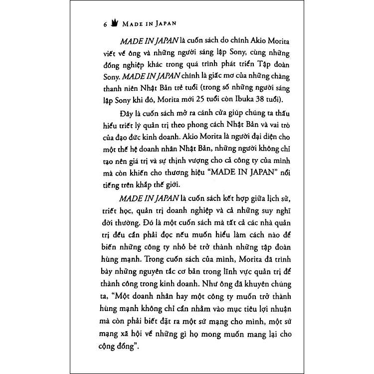 Trong Mua Made In Japan, Akio Morita – một trong những người sáng lập Sony, đã chia sẻ câu chuyện về quá trình hình thành và phát triển của tập đoàn này. Từ những ngày đầu khốn khó, khi một nhóm người tụ tập quanh một tòa nhà bách hóa bị cháy ở Tokyo, họ đã cùng nhau nuôi dưỡng một giấc mơ lớn lao: khôi phục nền kinh tế Nhật Bản thông qua công nghệ. Cuốn sách mở ra cánh cửa đến với triết lý quản trị Nhật Bản và vai trò của đạo đức kinh doanh trong sự nghiệp của Sony.
