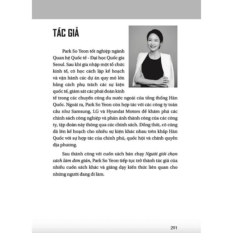 Park So Yeon là một chuyên gia chiến lược nổi tiếng tại Hàn Quốc với nhiều năm kinh nghiệm làm việc cùng các lãnh đạo và tổ chức lớn. Với những thành tựu nổi bật trong lĩnh vực tư vấn và đào tạo, tác giả đã xây dựng được uy tín vững chắc. Những phương pháp và nguyên tắc mà cô trình bày trong cuốn sách đều xuất phát từ những quan sát thực tế và kinh nghiệm phong phú mà cô đã tích lũy.