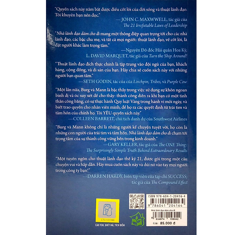 Cuốn sách này không chỉ mang lại cho bạn những bài học quý giá mà còn là nguồn cảm hứng để trở thành một nhà lãnh đạo thực thụ. “Cho đi không chỉ là nhận lại, mà còn là cách xây dựng mối quan hệ bền vững.” Hãy để những bài học trong “Nhà Lãnh Đạo Dám Cho Đi” giúp bạn tìm ra con đường phù hợp cho bản thân trong sự nghiệp.