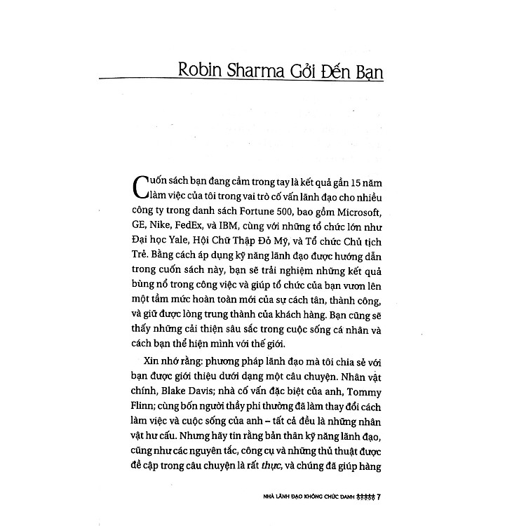 Robin Sharma là một trong những nhà cố vấn lãnh đạo nổi tiếng nhất thế giới, với hơn 15 năm kinh nghiệm làm việc với các công ty trong danh sách Fortune 500. Ông đã giúp đỡ hàng triệu người trên toàn cầu trong việc phát triển kỹ năng lãnh đạo và đạt được thành công trong cả công việc lẫn cuộc sống cá nhân. Với những thành tựu nổi bật, ông đã khẳng định được uy tín và vị thế của mình trong lĩnh vực lãnh đạo.