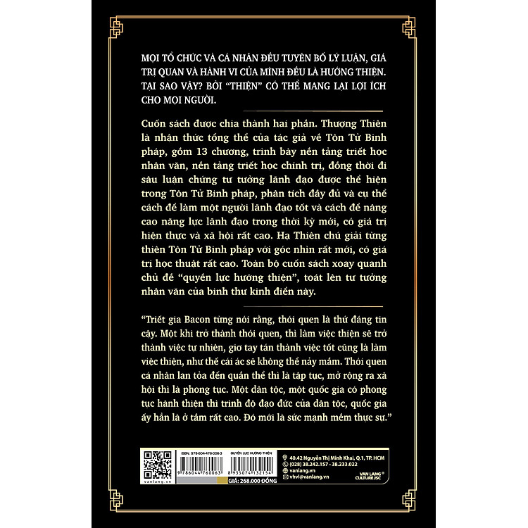 - Nội dung: Sách chia thành hai phần: Thượng Thiên (phân tích Tôn Tử Binh pháp, triết học nhân văn và chính trị) và Hạ Thiên (chú giải Tôn Tử Binh pháp với góc nhìn mới).