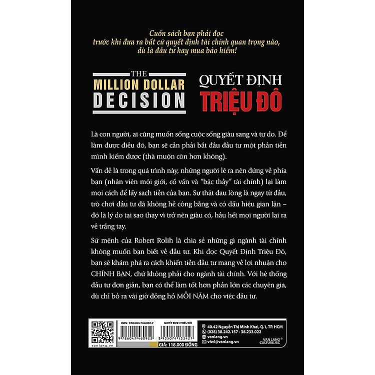 Quyết Định Triệu Đô không chỉ đơn thuần là một cuốn sách về đầu tư, mà còn là một hướng dẫn thực tế giúp bạn hiểu rõ hơn về cách thức vận hành của ngành tài chính. Robert Rolih, tác giả của cuốn sách, chỉ ra rằng sự thật đau lòng là không ít nhân viên môi giới và cố vấn tài chính thường tìm cách trục lợi từ bạn, thay vì hỗ trợ bạn đầu tư hiệu quả. Cuốn sách sẽ giúp bạn khám phá cách kiếm tiền từ đầu tư mà không bị ảnh hưởng bởi những thế lực bên ngoài.