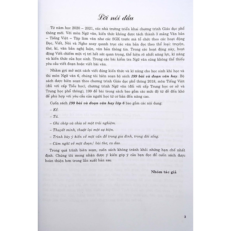 - Bộ sách “199 Bài Và Đoạn Văn Hay Lớp 6” phù hợp với chương trình Giáo dục phổ thông mới từ năm 2020.