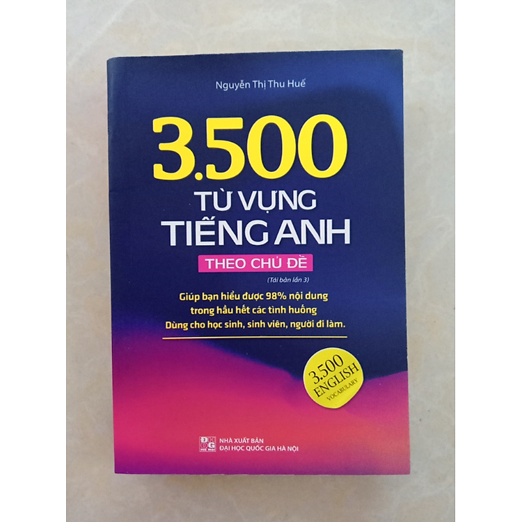 3500 từ vựng tiếng Anh theo chủ đề (bản màu) Điều quan trọng nhất khi học từ vựng tiếng Anh là bạn phải sử dụng từ mới (new word). Cách tốt nhất là bạn nên học từ vựng trong một ngữ cảnh liên quan, không phải chỉ đọc một danh sách dài các từ mớ Dưới đây là 7 bí quyết giúp bạn học từ vựng tiếng Anh nhanh và hiệu quả: 1. Dùng từ mới vào một câu văn cụ thể 2. Tìm hiểu các cách sử dụng khác nhau về ngữ pháp của từ mới 3. Liên kết các từ vựng với nhau 4. Mang theo một cuốn sổ note về từ vựng để bạn có thể học mọi lúc mọi nơi 5. Tạo flash cards 6. Tìm ví dụ về từ mới trên Internet (Google) 7. Học lại từ mới vào một ngày đẹp trời khácGiá sản phẩm trên Tiki đã bao gồm thuế theo luật hiện hành. Bên cạnh đó, tuỳ vào loại sản phẩm, hình thức và địa chỉ giao hàng mà có thể phát sinh thêm chi phí khác như phí vận chuyển, phụ phí hàng cồng kềnh, thuế nhập khẩu (đối với đơn hàng giao từ nước ngoài có giá trị trên 1 triệu đồng)…..