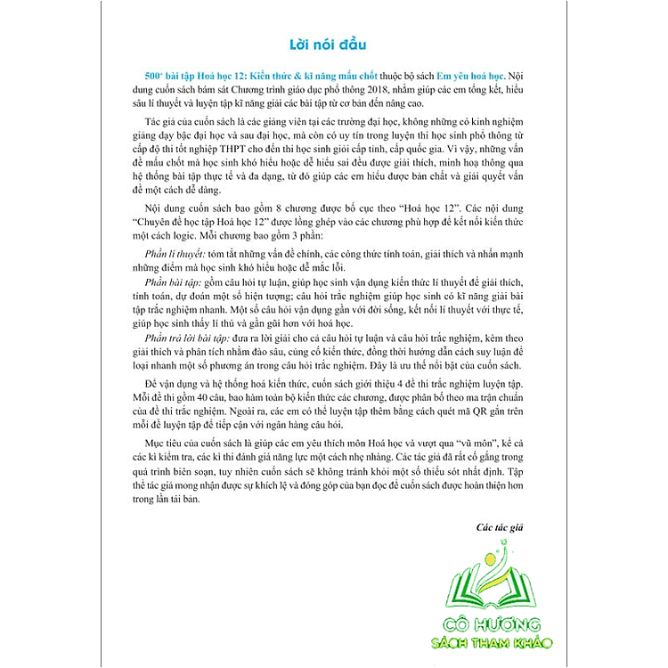 Tác giả của cuốn sách là các giảng viên tại các trường đại học, không những có kinh nghiệm giảng dạy bậc đại học và sau đại học, mà còn có uy tín trong luyện thi học sinh phổ thông từ cấp độ thi tốt nghiệp THPT cho đến thi học sinh giỏi cấp tỉnh, cấp quốc gia. Vì vậy, những vấn để mấu chốt mà học sinh khó hiểu hoặc dễ hiểu sai đều được giải thích, minh hoạ thông qua hệ thống bài tập thực tế và đa dạng, từ đó giúp các em hiểu được bản chất và giải quyết vấn đề một cách dễ dàng.