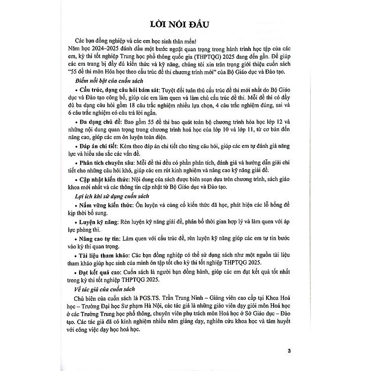 Năm học 2024–2025 đánh dấu một bước ngoặt quan trọng trong hành trình học tập của các em, kỳ thi tốt nghiệp Trung học phổ thông quốc gia (THPTQG) 2025 đang đến gần. Để giúp các em trang bị đầy đủ kiến thức và kỹ năng, chúng tôi xin trân trọng giới thiệu cuốn sách “55 đề thi môn Hóa học theo cấu trúc đề thi chương trình mới” của Bộ Giáo dục và Đào tạo.