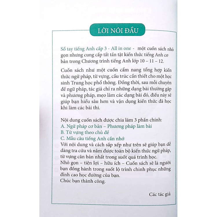 Sổ tay tiếng Anh cấp 3 – All in one – một cuốn sách nhỏ gọn nhưng cung cấp tất tần tật kiến thức tiếng Anh cơ bản trong Chương trình tiếng Anh lớp 10 – 11 – 12.