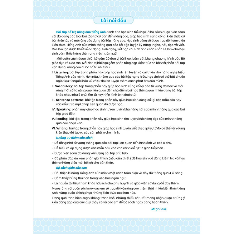 Cuốn sách giúp các em cải thiện đầy đủ và toàn diện 4 kỹ năng. Mong rằng với cuốn sách Bài Tập Bổ Trợ Nâng Cao Tiếng Anh Lớp 3 này các em sẽ trau dồi và nâng cao thêm thật nhiều kiến thức tiếng Anh, vững bước chinh phục những kiến thức cao hơn nữa.
