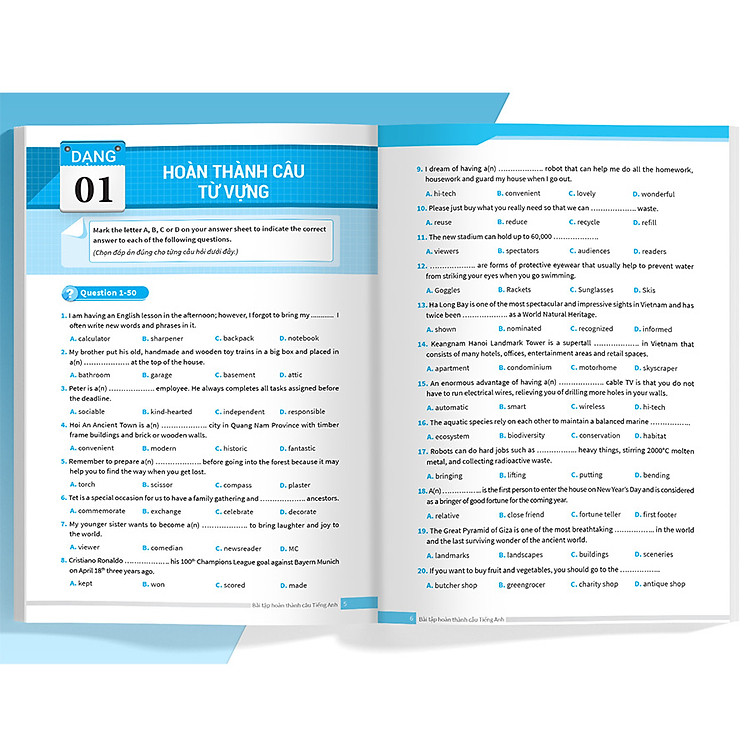 Với bài tập Hoàn thành câu trong kì thi vào 10 và 10 chuyên, cuốn sách phân chia làm 2 dạng: 200 câu hỏi dạng hoàn thành câu từ vựng và 200 câu hỏi dạng hoàn thành câu ngữ pháp