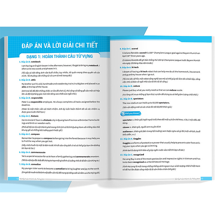 Lời giải chi tiết, giải thích kỹ lưỡng và bổ sung đầy đủ công thức, các cấu trúc tiếng anh cần nhớ giúp các em ôn tập lại kiến thức một lần nữa, đồng thời tự nhận xét được năng lực bản thân, thấy được lỗi sai cần tránh, kịp thời lấp đầy lỗ hổng kiến thức, tìm ra các phương pháp làm bài nhanh, từ đó nâng cao năng lực của bản thân.