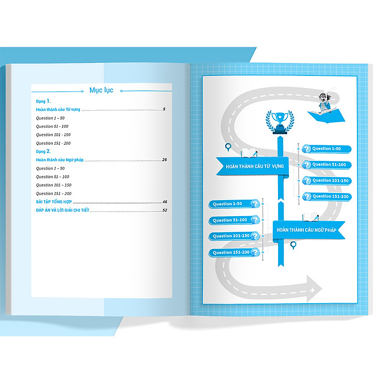 - Bao gồm 200 câu hỏi hoàn thành câu từ vựng và 200 câu hỏi hoàn thành câu ngữ pháp.