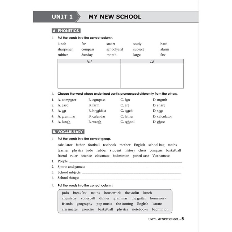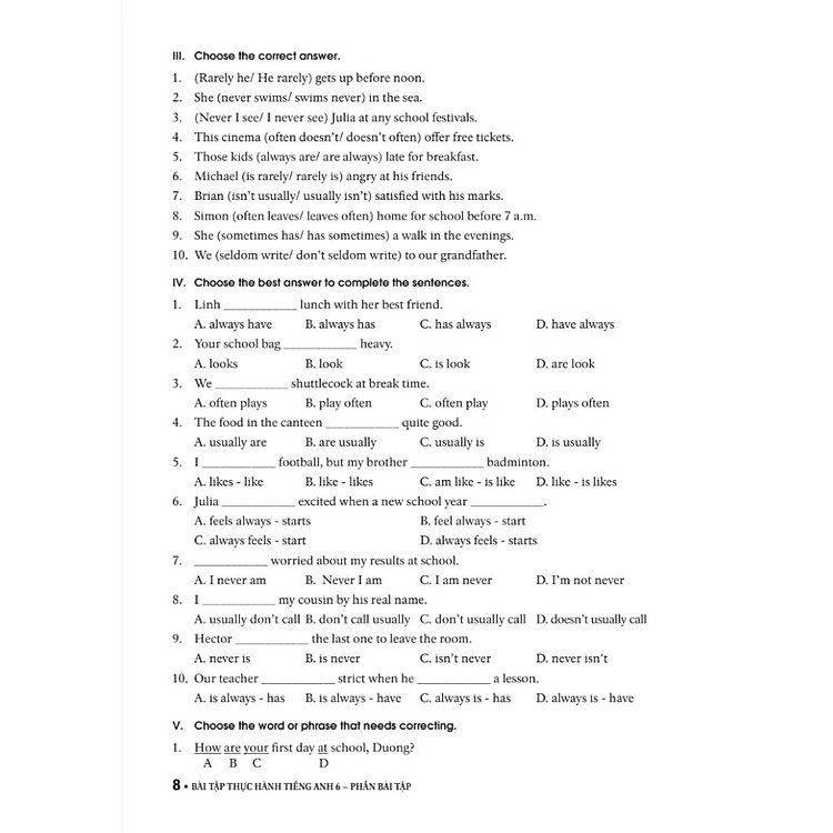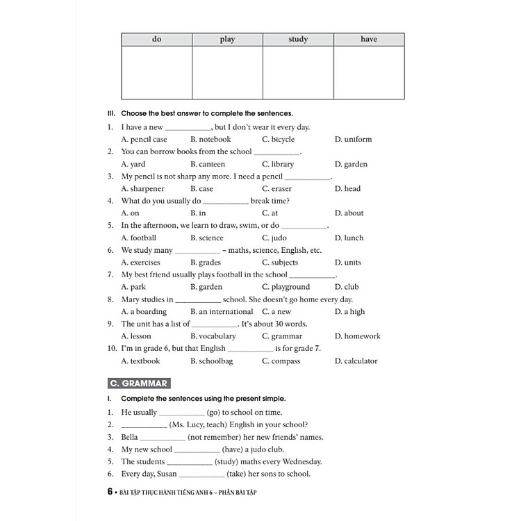 Bài tập thực hành tiếng Anh 6 gồm 12 đơn vị bài tập, mỗi đơn vị tương ứng với một chủ đề trong sách giáo khoa. Các bài tập được thiết kế đa dạng từ việc điền từ, chọn đáp án, cho đến viết câu hoàn chỉnh. Điều này không chỉ giúp học sinh cải thiện khả năng ngữ pháp mà còn phát triển kỹ năng nghe, nói, đọc, viết một cách toàn diện.