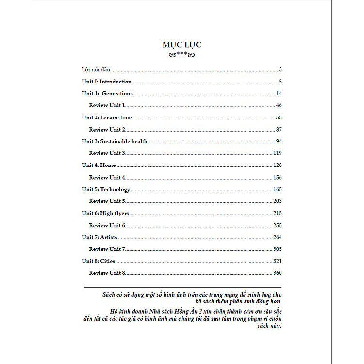 - Cấu trúc: Bao gồm 1 bài ôn tập và 8 đơn vị bài học chính với nhiều chủ đề đa dạng.