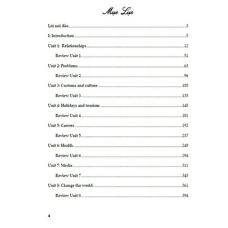 - Nội dung: Bao gồm 1 bài ôn tập và 8 đơn vị bài học chính về các chủ đề như Relationships, Problems, Customs and culture, Holidays, Careers, Health, Media, Change the world.