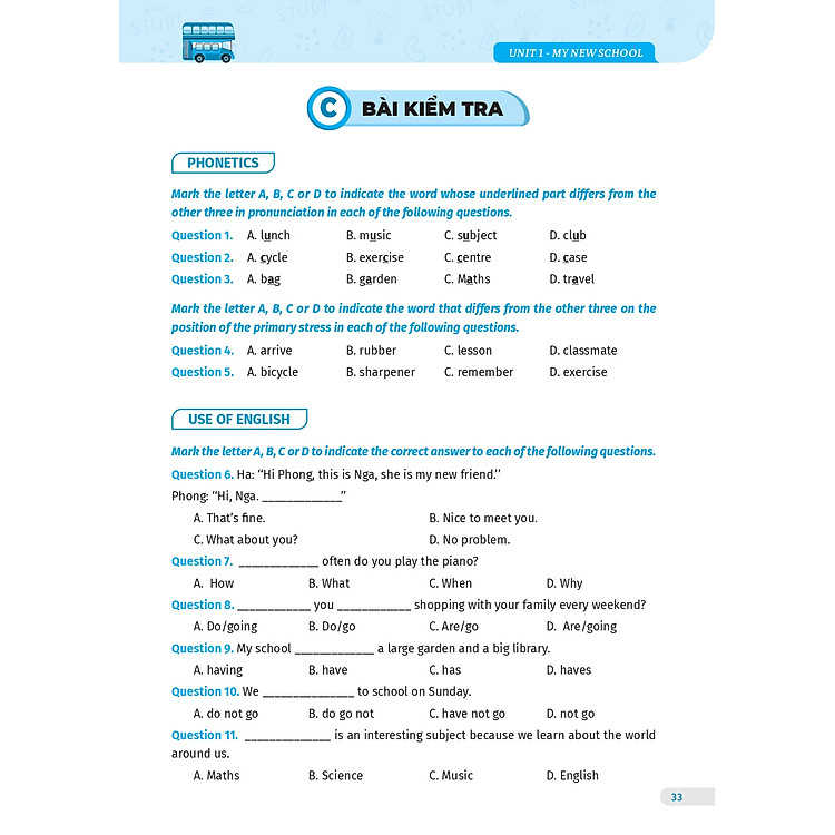 Phần bài kiểm tra tiếng Anh thiết kế theo dạng thực bài kiểm tra giữa kỳ, cuối kỳ vừa giúp các em ôn tập các kiến thức đã học trong từng đơn vị bài học, vừa giúp các em nắm vững cấu trúc bài thi trong chương trình học.