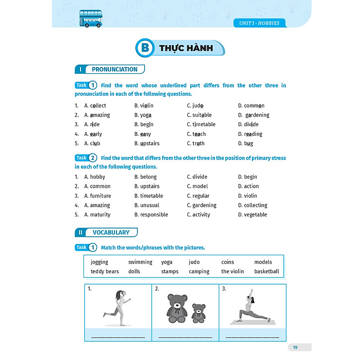 Bài thực hành là các dạng bài tập bổ trợ cơ bản và nâng cao giúp các em thực hành tất cả các khía cạnh tiếng Anh theo từng đơn vị bài học. Bài thực hành gồm có các phần: