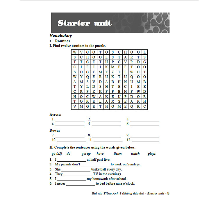 Bài tập Tiếng Anh 8 – Không đáp án gồm một bài ôn tập củng cố kiến thức đã học (Starter Unit), và 8 đơn vị bài học chính: Fads and fashions, Sensations, Adventure, Material world, Years ahead, Learn, Big ideas, On screen và sau mỗi đơn vị bài học đều có bài ôn tập Review.