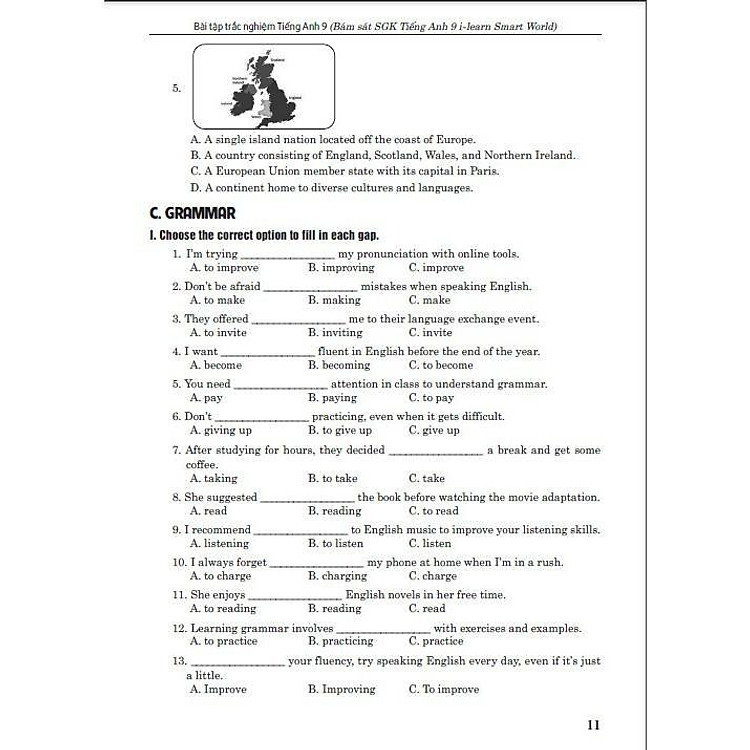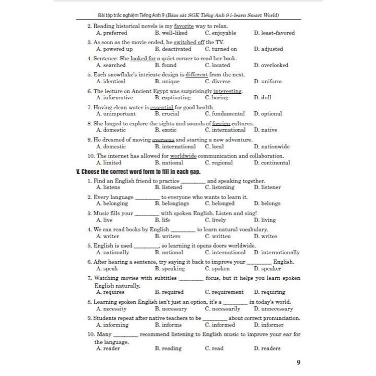- Cuốn sách “Bài Tập Trắc Nghiệm Tiếng Anh 9” bám sát SGK i-learn Smart World.